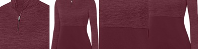 100% polyester heathered wicking knit top body, collar and sleeves ; 100% polyester wicking knit solid bottom body ; Ladies' fit ; Pad print label ; Quarter-zip pullover style; Self-fabric collar ; Set-in sleeves ;