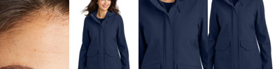 Set-in sleeves; Self-fabric thumb-hole cuffs; High neckline and lapover hood construction;